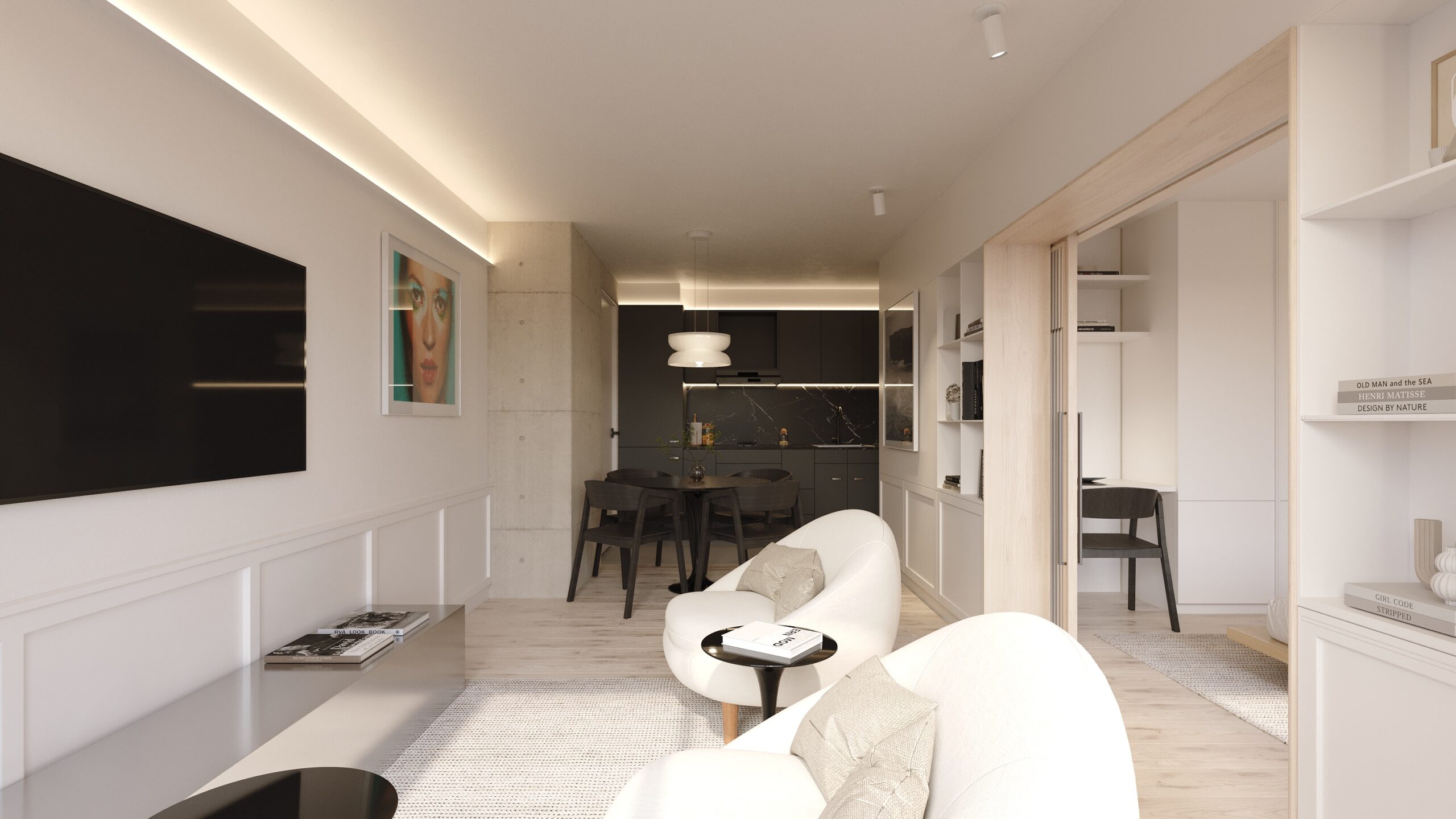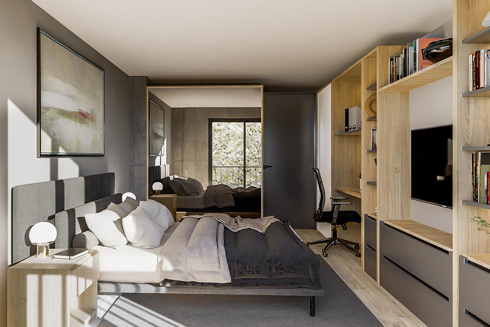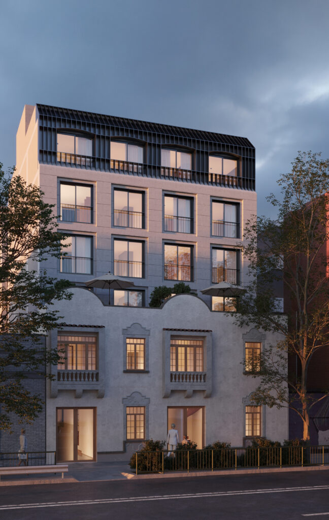 El edificio de departamentos se levanta sobre una casa original con fachada catalogada, lo que le da presencia y modernidad en un mismo concepto, preservando el encanto histórico del barrio. Un proyecto de diseño interior sobrio y contemporáneo.